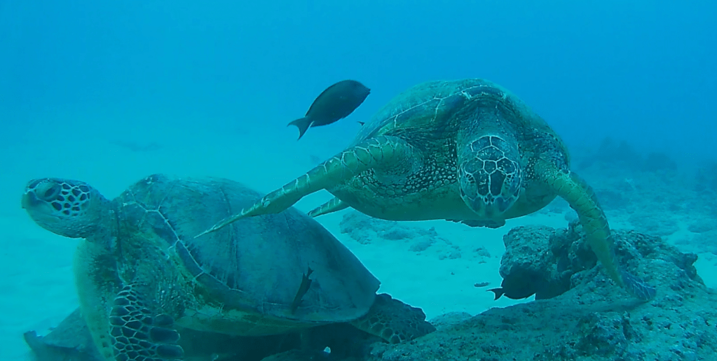 Today, green sea turtles are listed as endangered or threatened in many parts of the world. They face numerous threats, including habitat loss, plastic pollution, entanglement in fishing gear, illegal poaching, and the impacts of climate change on nesting beaches. But in places like Hawaii, Honu are strictly protected and is illegal to touch or harass them. I was lucky enough to be taken to a Honu cleaning station and with a guide dove down to say hi: https://youtu.be/5gMkiXuuk20 (also listen out for a Humpback whale singing).