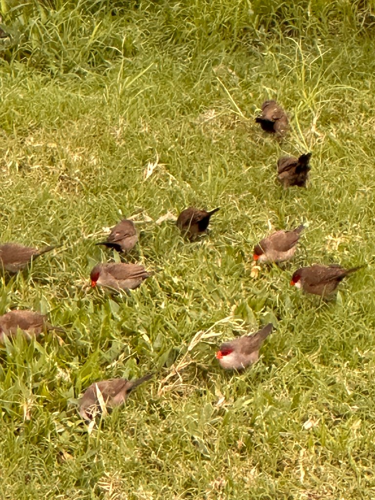 In their native range, Common Waxbills are found throughout sub-Saharan Africa, particularly in grasslands/savannahs. Due to escapes and releases from captivity (being very adaptable) they have also established populations in other parts of the world, including southern Europe (notably Portugal, Spain, and southern France), parts of South America such as Brazil, several Indian Ocean islands and regions of the Middle East. They adapt easily to human-altered landscapes and are often found in parks and farmland.